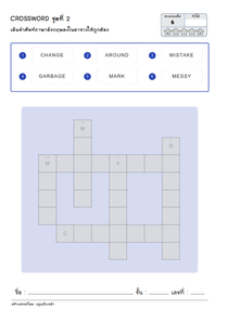 ใบงานครอสเวิร์ดเติมคำศัพท์ภาษาอังกฤษ 6 คำ พร้อมตัวเลขข้อและอักษรตัวแรก