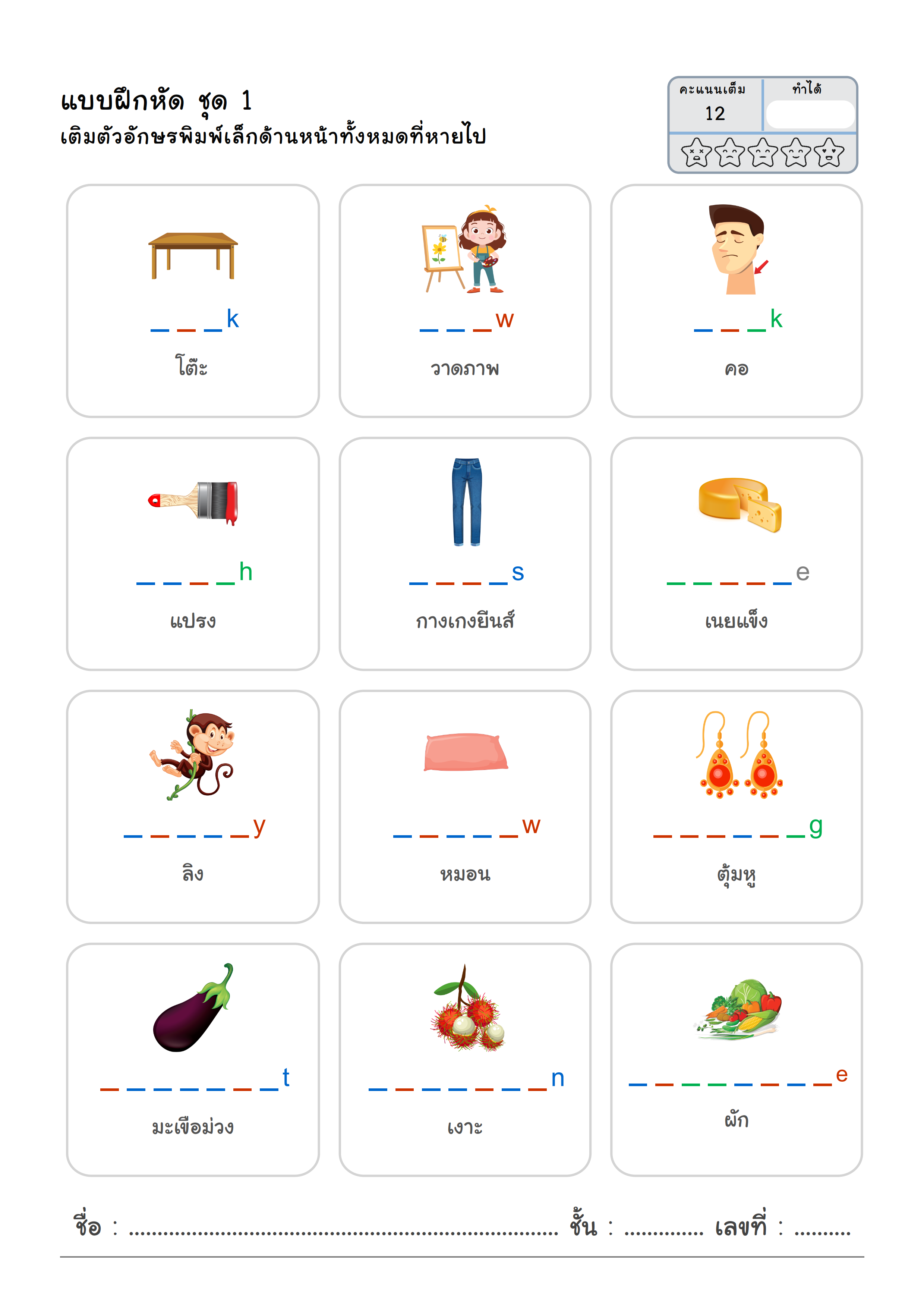 {{{237255|675275}}} แบบฝึกหัดเติมคำศัพท์ภาษาอังกฤษลงในช่องว่าง ช่วยฝึกทักษะให้ผู้เรียนเป็นคนช่างสังเกตและจดจำ เมื่อตัวอักษรตัวใดตัวหนึ่งหายไป น้องๆจะใช้การคิดวิเคราะห์ถึงการจัดเรียงตัวอักษรก่อนหลังแล้วเขียนเติมลงไปตามที่จำได้ หากฝึกเขียนเติมคำศัพท์เป็นประจำจากตัวที่หายไปก็จะเกิดความชำนาญและจำคำศัพท์นั้นได้ค่ะ