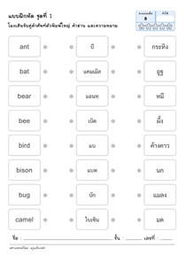 แบบฝึกโยงเส้นจับคู่ความหมาย คำอ่าน และคำศัพท์ตัวพิมพ์เล็ก
