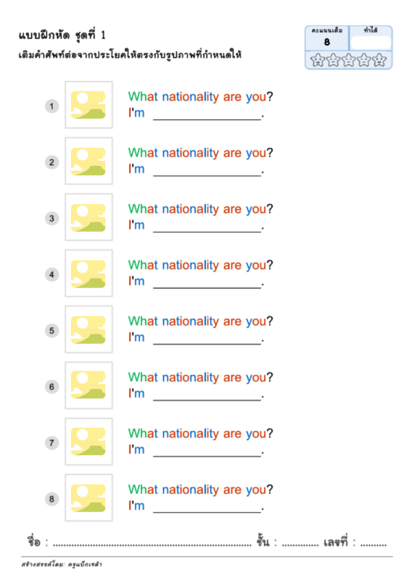 แบบฝึกเติมศัพท์ภาษาอังกฤษจากประโยคถาม-ตอบเกี่ยวกับสัญชาติ