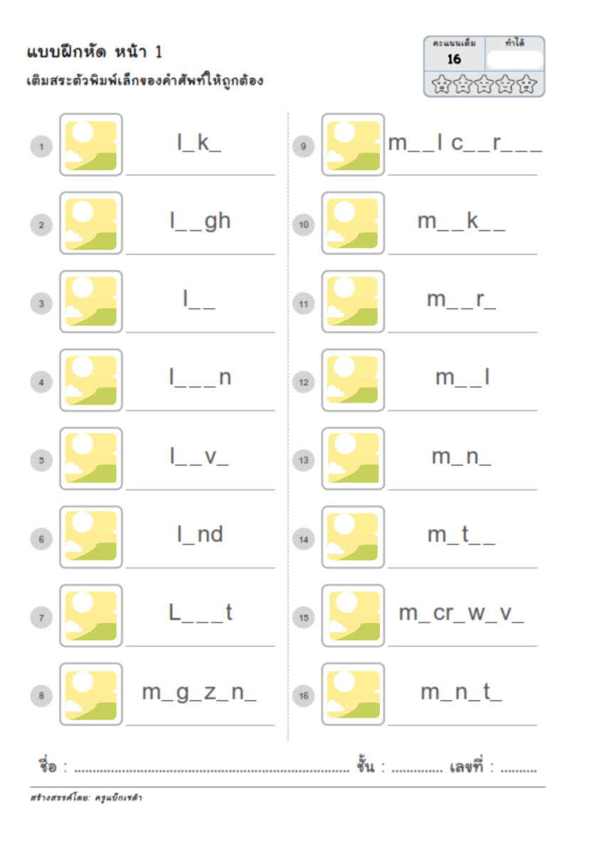 • แบบฝึกเติมสระภาษาอังกฤษ a, e, i, o, u เฉพาะในตำแหน่งที่หายไป