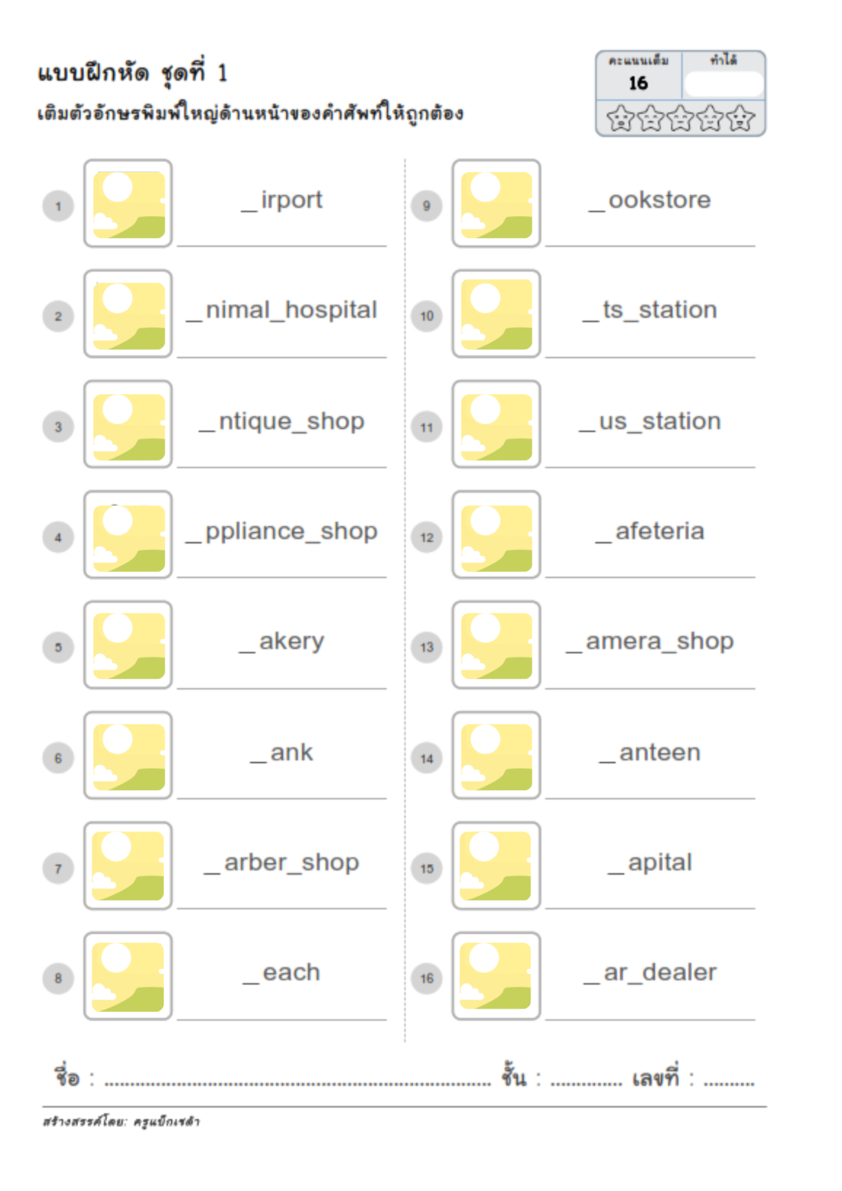 ใบงานนี้ออกแบบมาเพื่อฝึกให้นักเรียนเติมตัวอักษรพิมพ์ใหญ่ (Capital Letter) ด้านหน้าของคำศัพท์ภาษาอังกฤษให้ถูกต้อง โดยแต่ละคำจะมีช่องว่างสำหรับเติมตัวอักษรแรก พร้อมภาพประกอบที่ช่วยในการเดาคำศัพท์ เหมาะสำหรับการเสริมสร้างทักษะด้านการเขียน การสังเกตตัวอักษรต้นคำ และการจดจำคำศัพท์ภาษาอังกฤษได้อย่างแม่นยำมากขึ้น